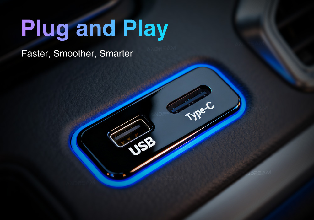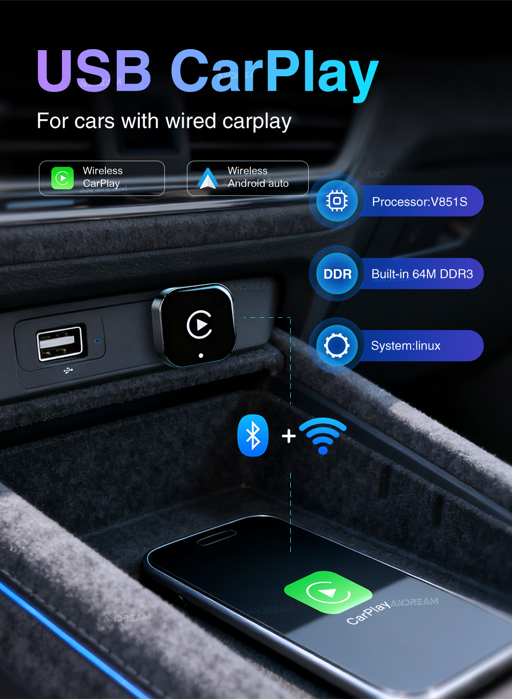 Is a compact, 2 in 1 wireless adapter that seamlessly supports both CarPlay and Android Auto. Plug in via USB-A (adapter included for USB-C). Smaller than a flash drive, it hides discreetly in your car while delivering fast boot times, smooth touch controls, and lag-free navigation.