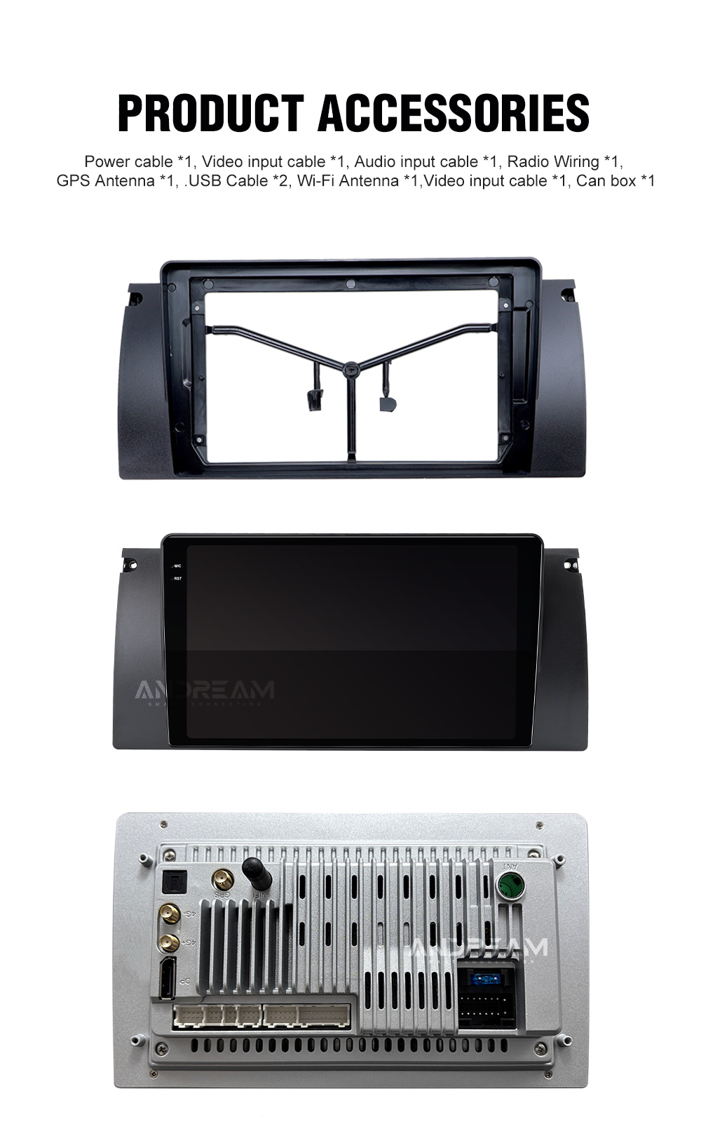 GPS Antenna *1, .USB Cable *2, Wi-Fi Antenna *1,Video input cable *1, Can box *1