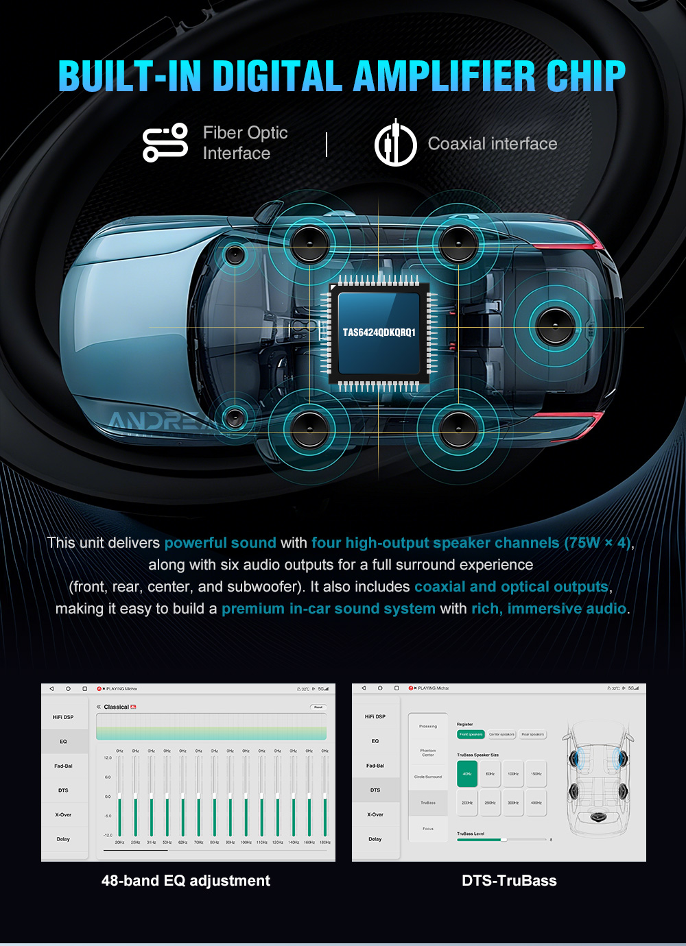 along with six audio outputs for a full surround experience (front, rear, center, and subwoofer). It also includes coaxial and optical outputs, making it easy to build a premium in-car sound system with rich, immersive audio.