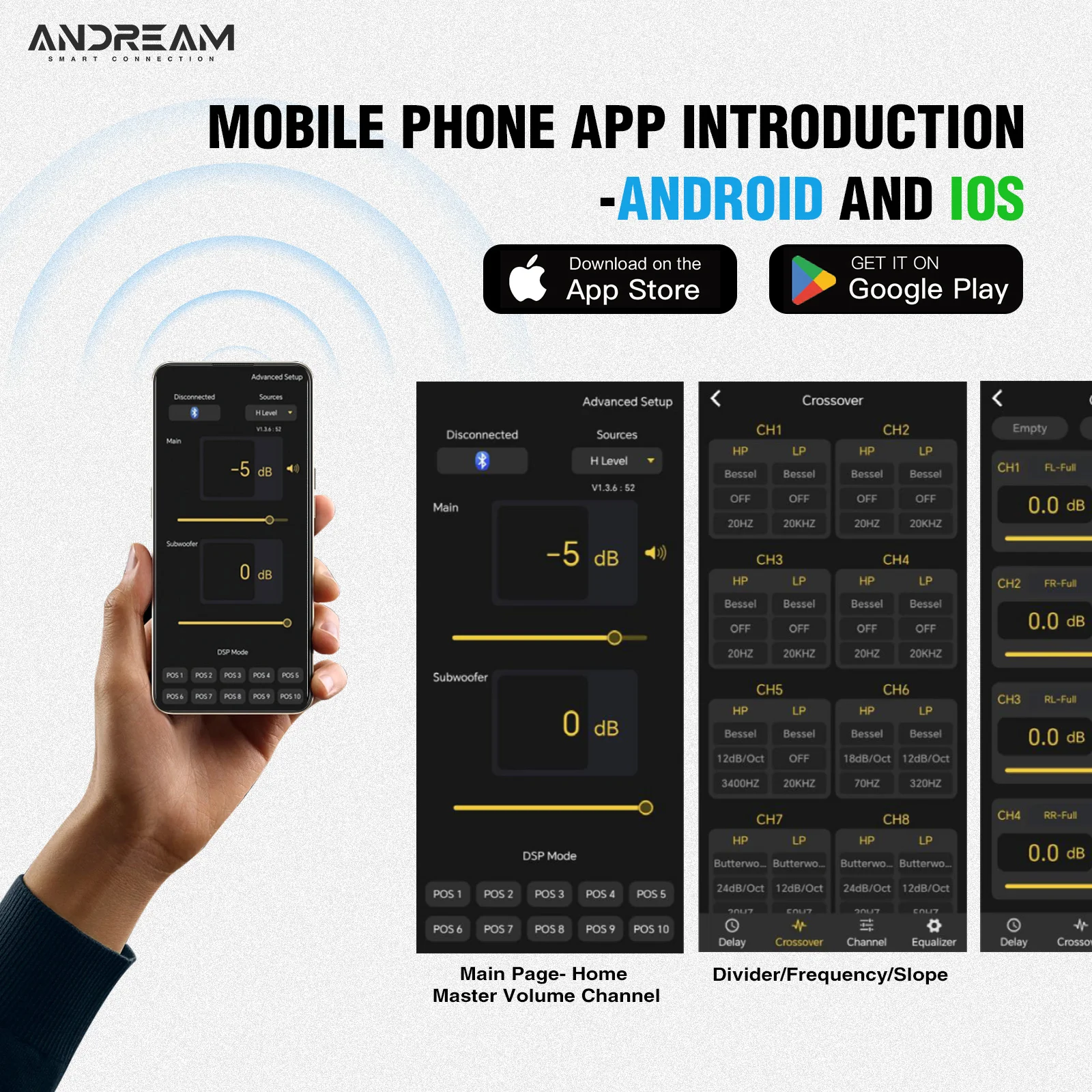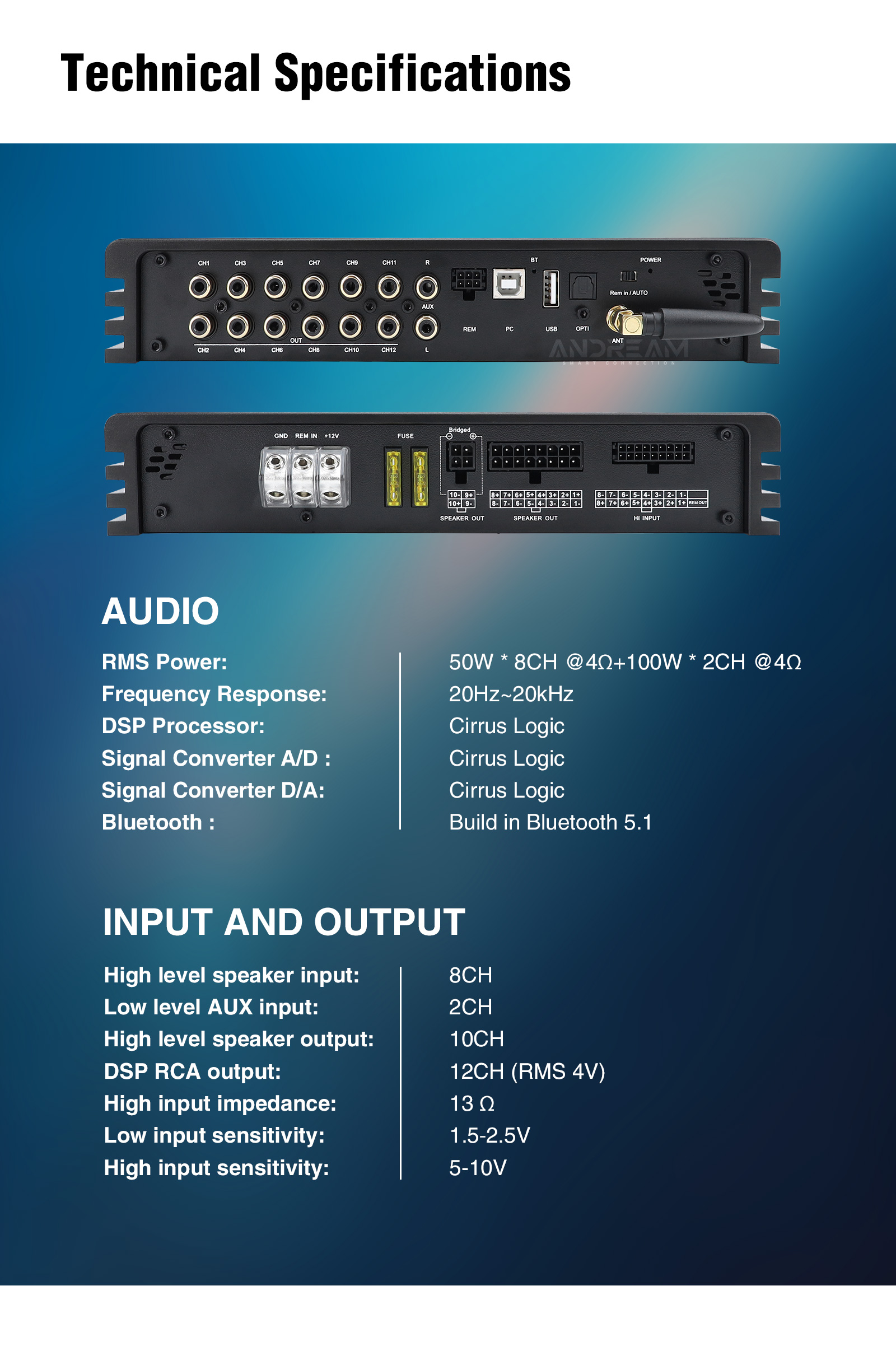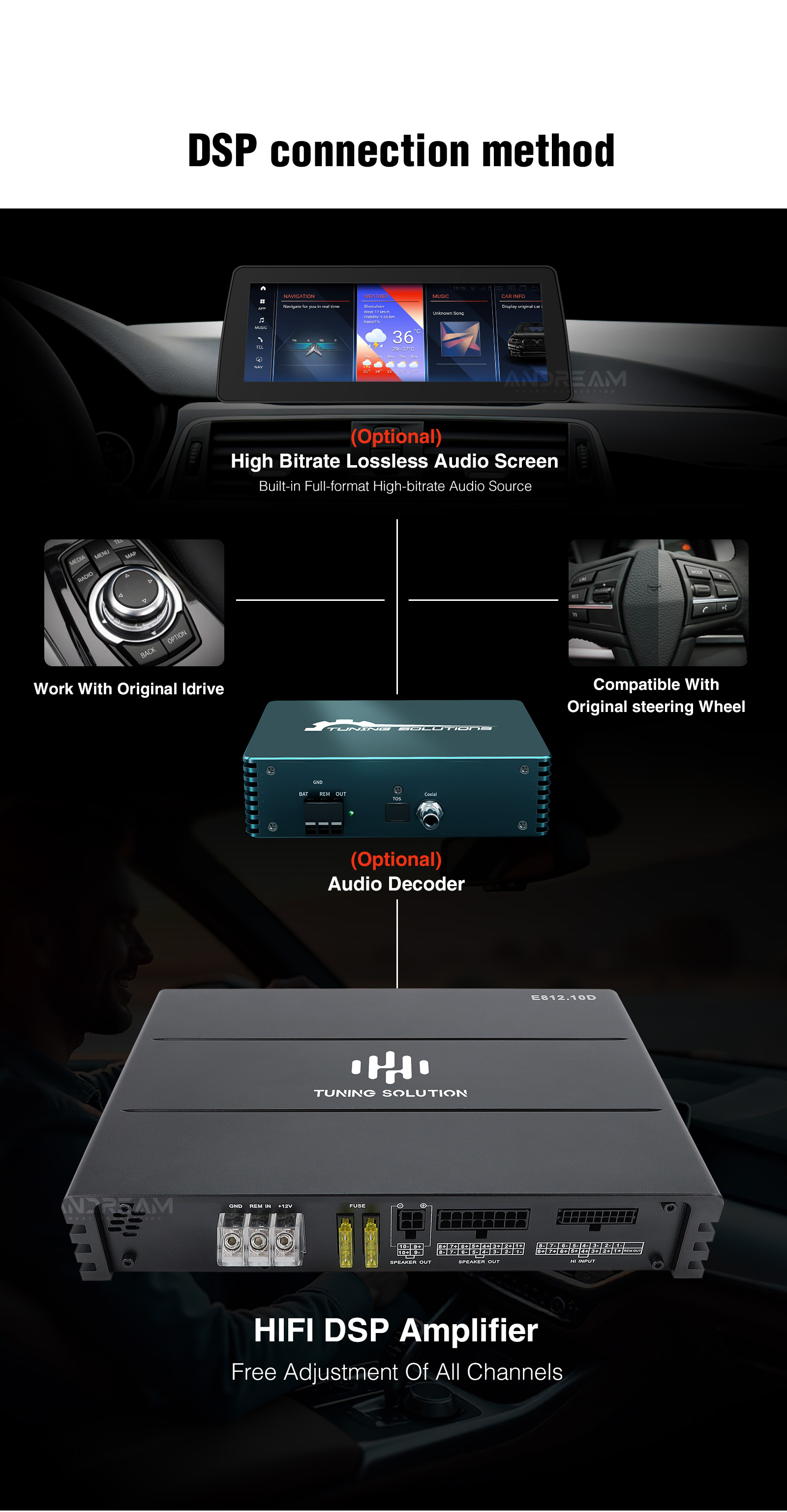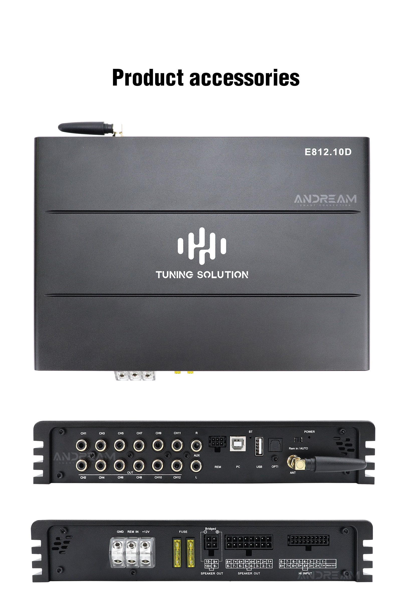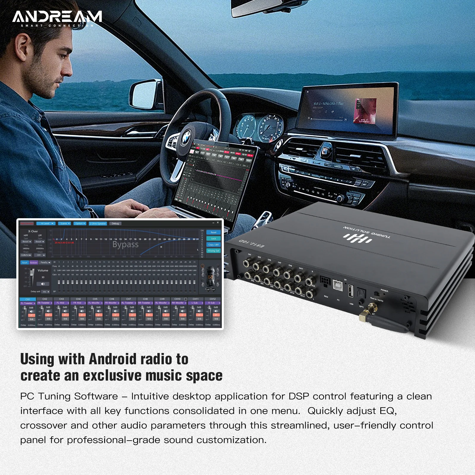 Andream 10-channel HiFi DSP amplifier integrated compatible with optical Ethernet audio box and Android screen with coaxial output