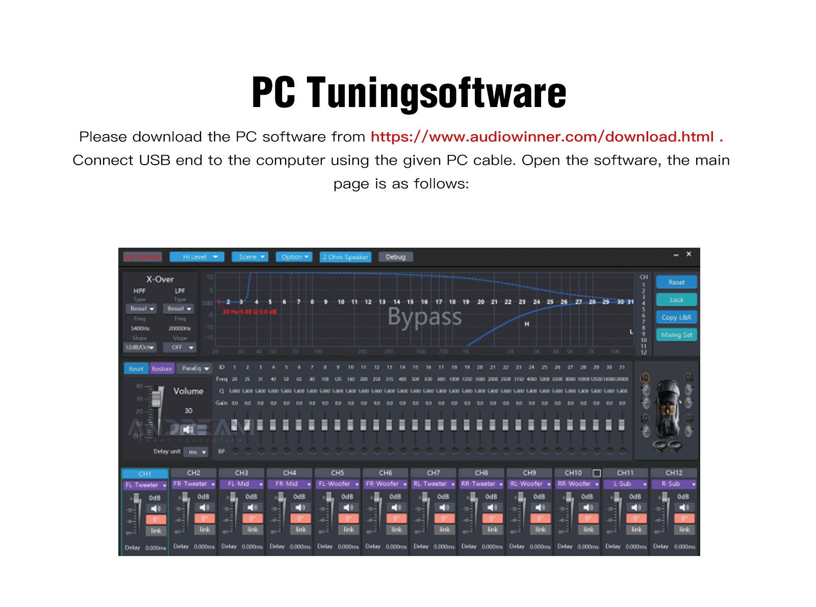 PC Tuning Software – Intuitive desktop application for DSP control featuring a clean interface with all key functions consolidated in one menu. Quickly adjust EQ, crossover and other audio parameters through this streamlined, user-friendly control panel for professional-grade sound customization.