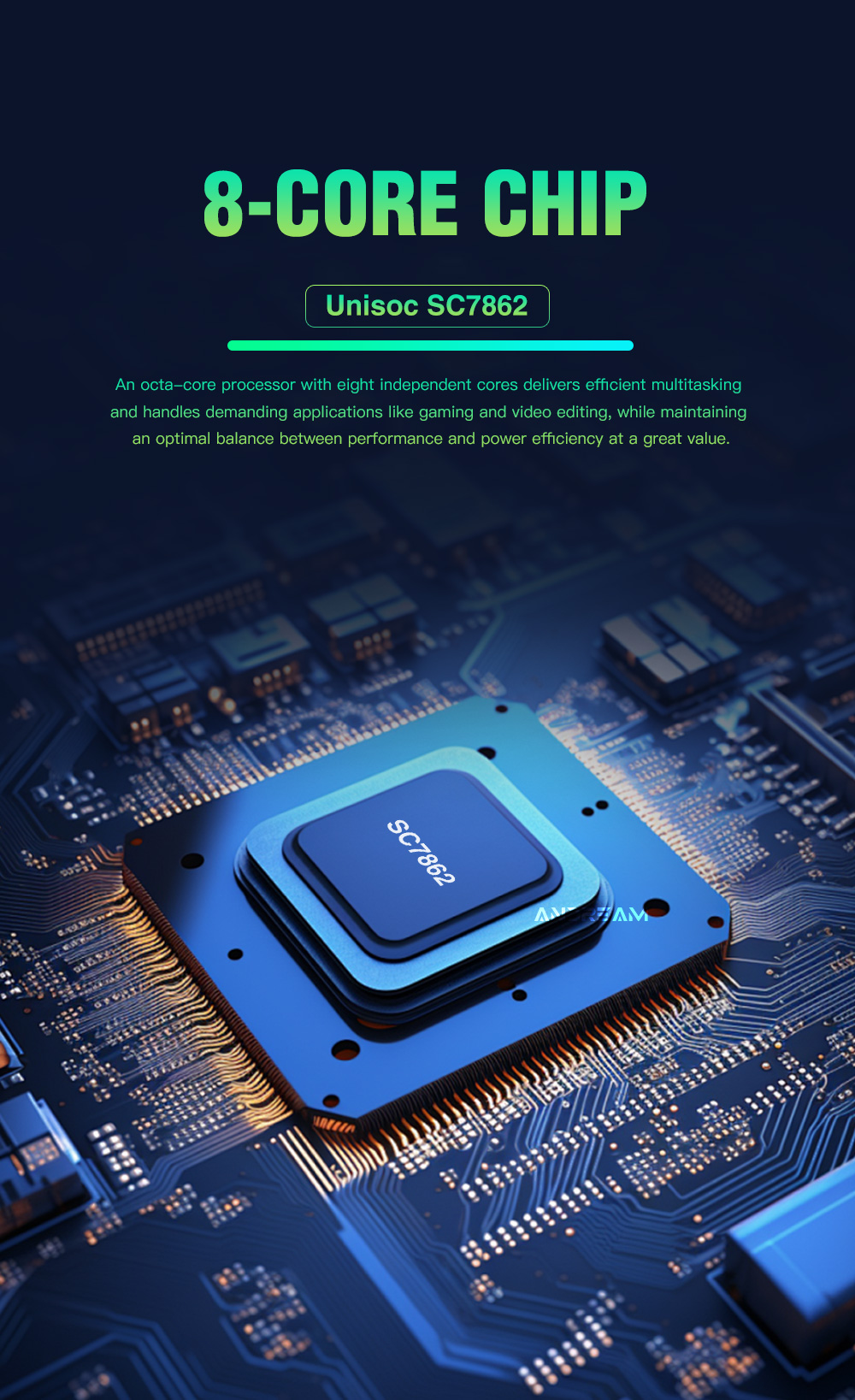 An octa-core processor with eight independent cores delivers efficient multitasking