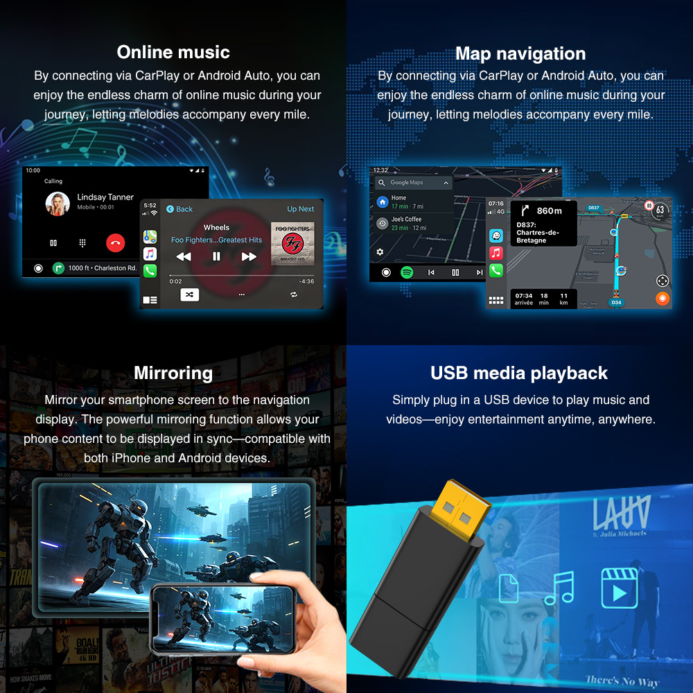 Supports wired & wireless mirroring functions for iphone and Android phones