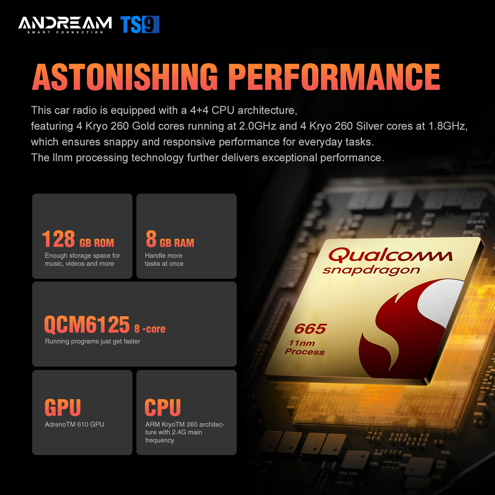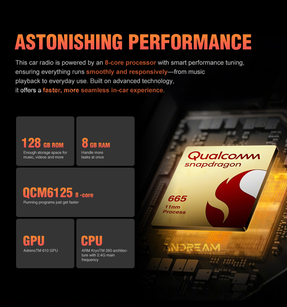 This car radio is powered by an 8-core processor with smart performance tuning,