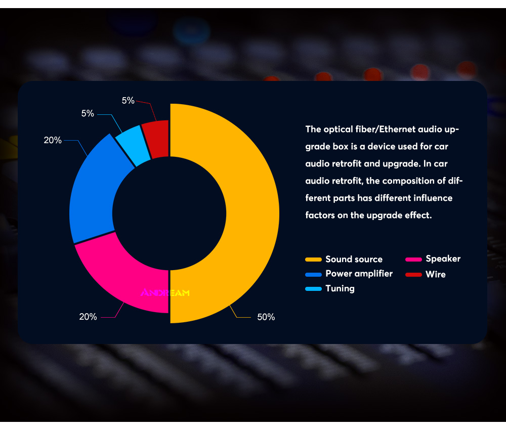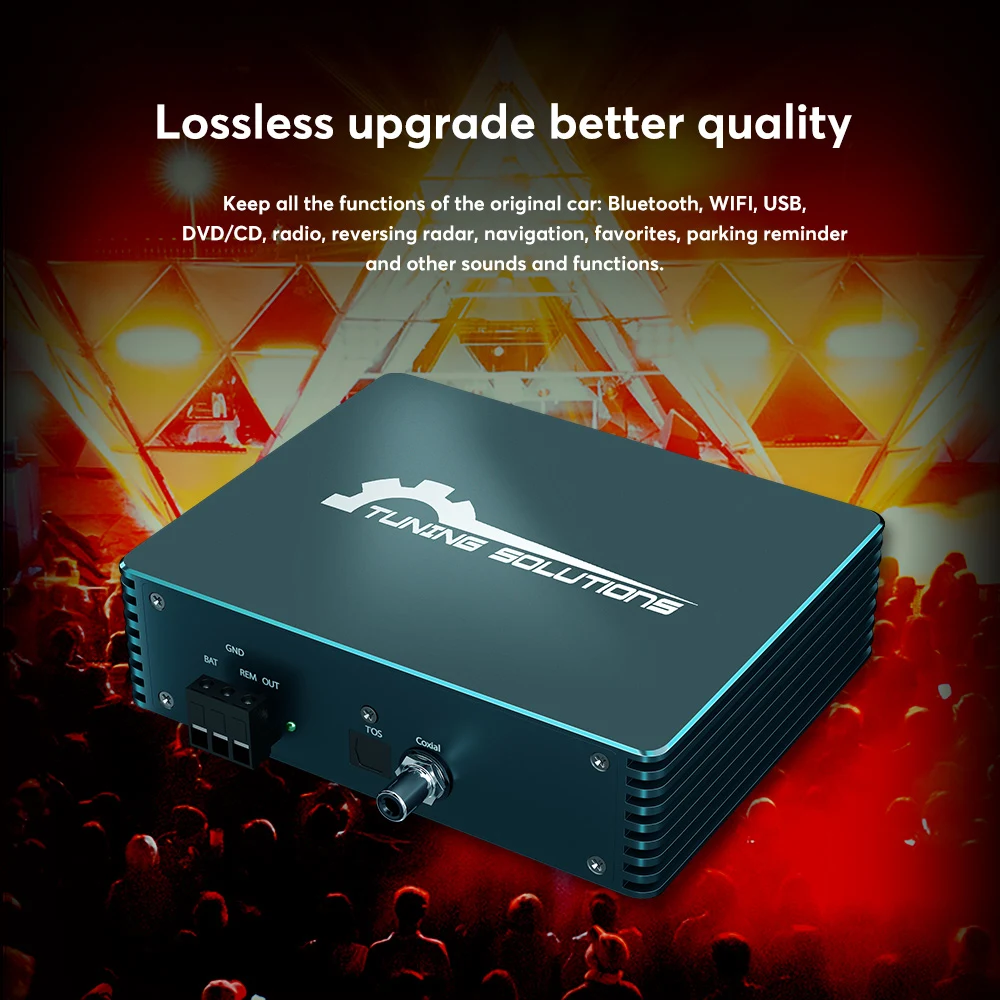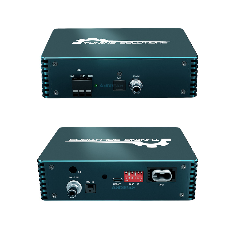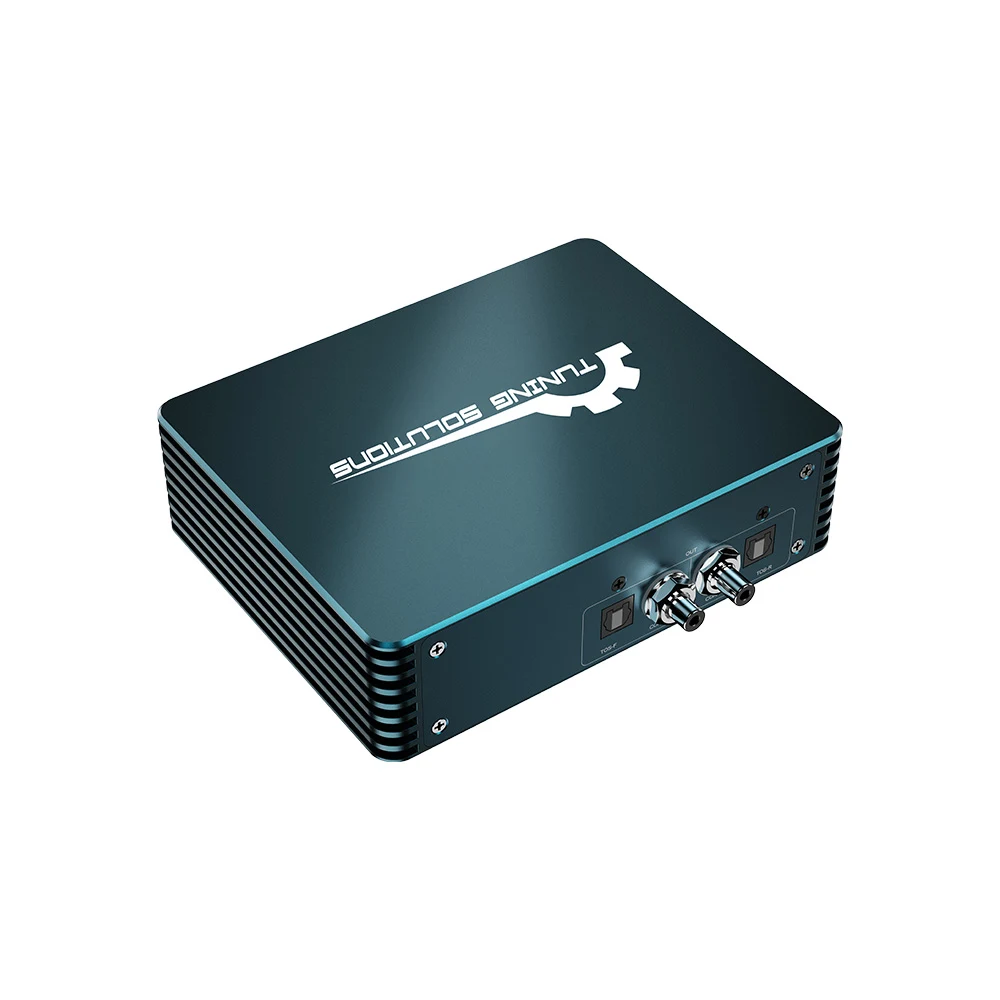 The function of the audio box is to separate the processing commands of the host for audio data, such as volume, sound effects, etc., and discard the original car power amplifier. It outputs general-purpose optical fiber/coaxial sound signals in the format required by professional audio equipment, thereby completing the conversion of car-specific network data to professional audio data. In this way, the unprocessed original sound source can be obtained, and at the same time, an external high-quality sound source can be added to match with the retrofit aftermarket power amplifier (with digital DSP function, supporting common optical fiber/coaxial signals), thereby bringing a perfect sound modification effect.