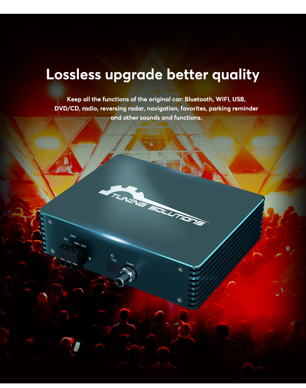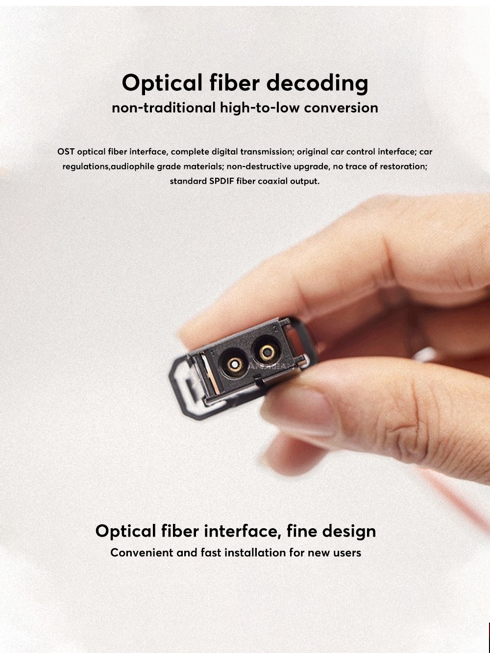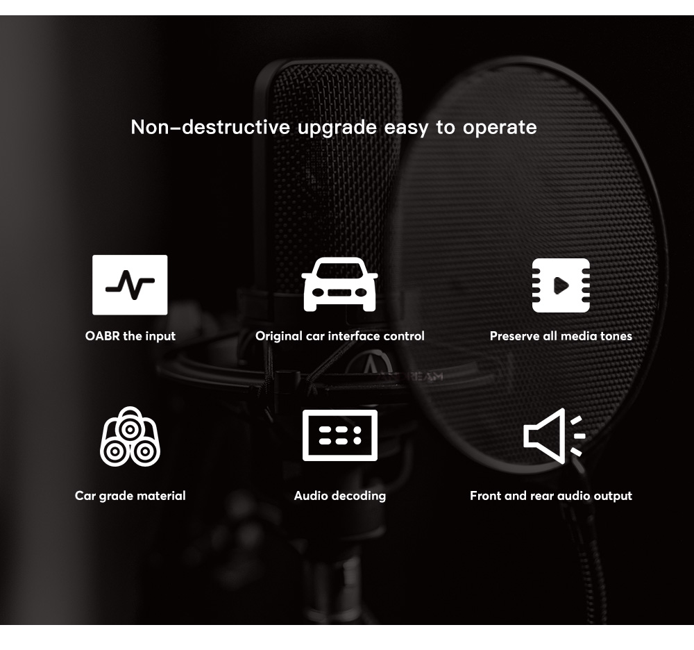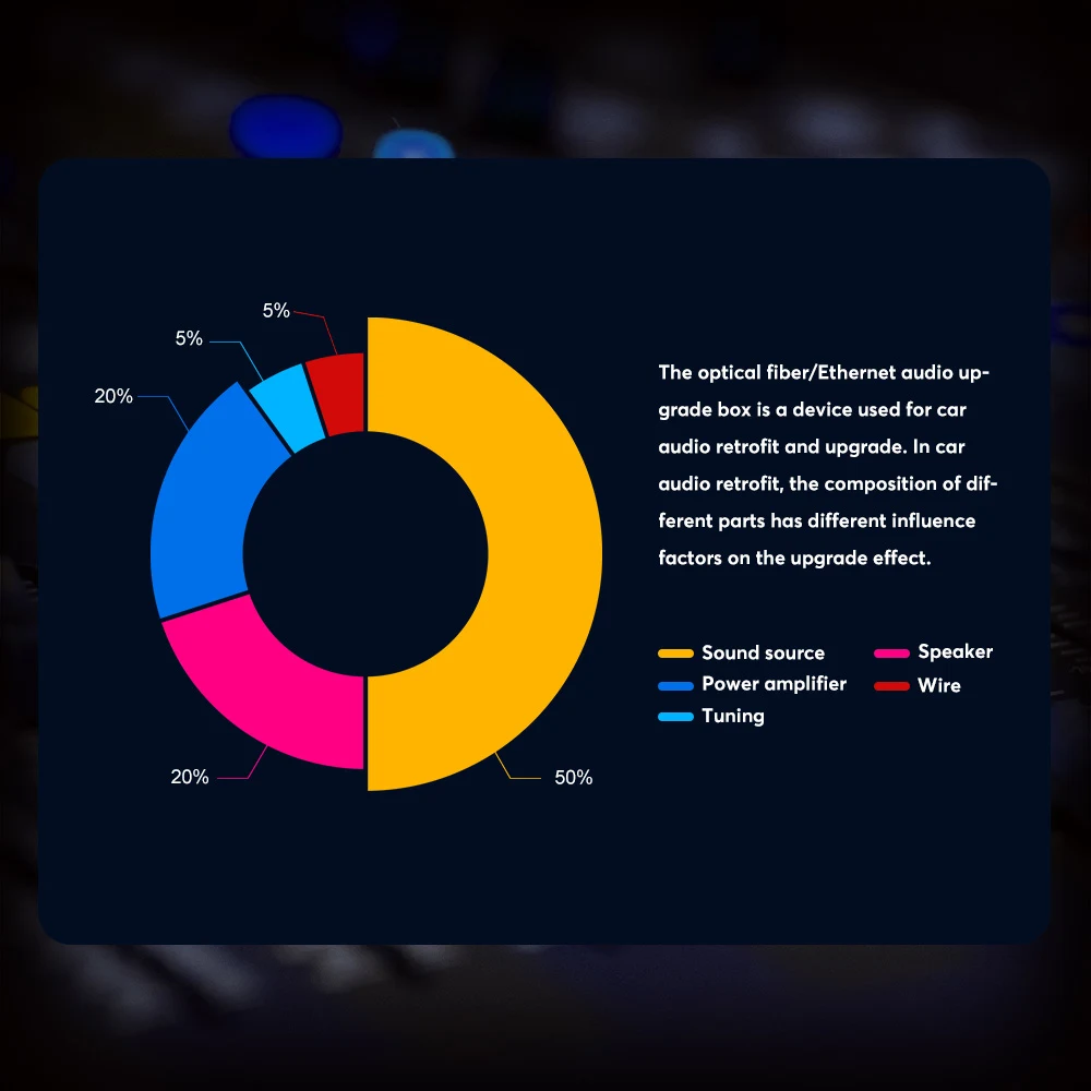 The function of the audio box is to separate the processing commands of the host for audio data, such as volume, sound effects, etc., and discard the original car power amplifier. It outputs general-purpose optical fiber/coaxial sound signals in the format required by professional audio equipment, thereby completing the conversion of car-specific network data to professional audio data. In this way, the unprocessed original sound source can be obtained, and at the same time, an external high-quality sound source can be added to match with the retrofit aftermarket power amplifier (with digital DSP function, supporting common optical fiber/coaxial signals), thereby bringing a perfect sound modification effect.